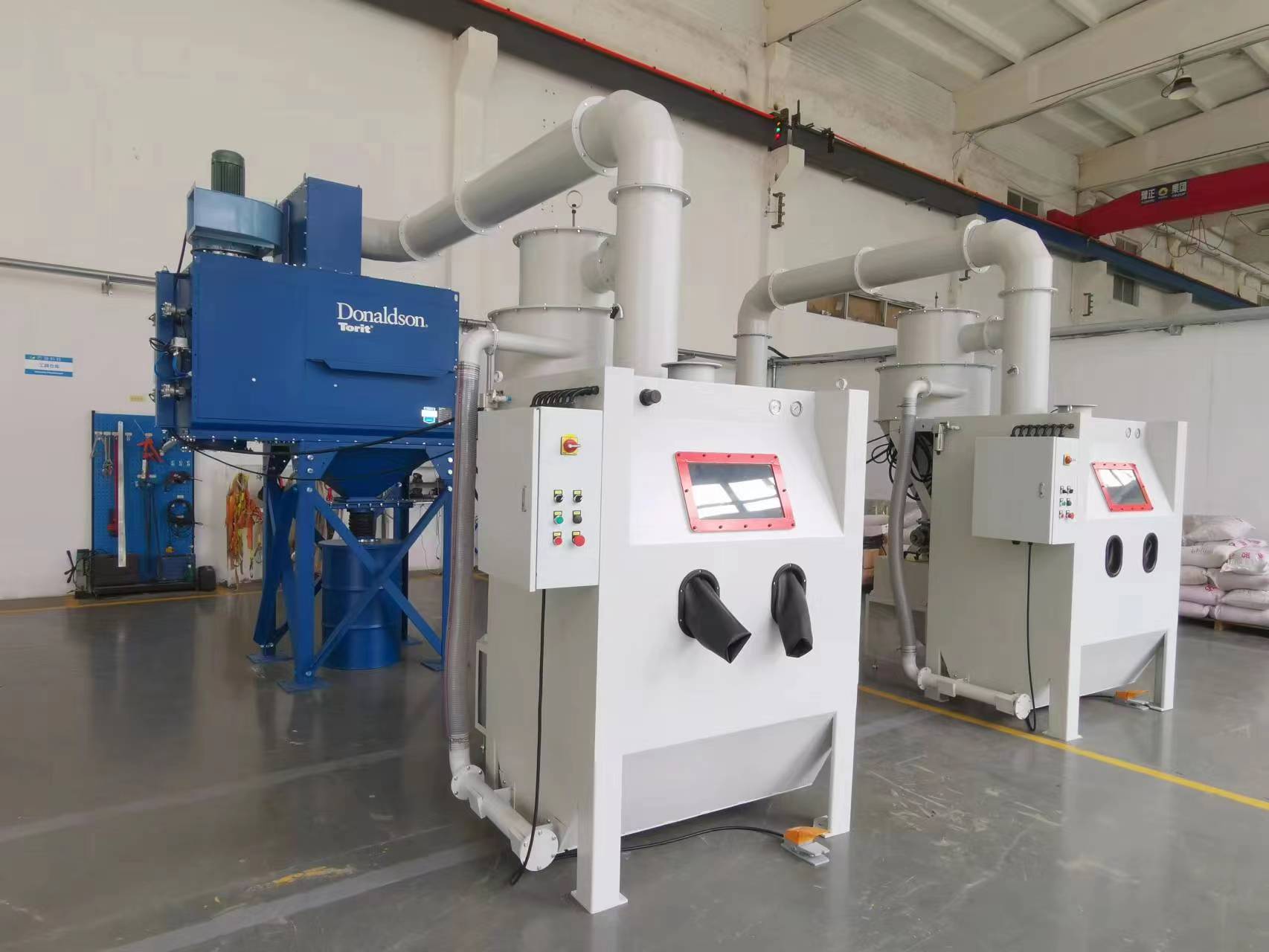 湖南株洲中國航發某航空企業訂購的2臺噴砂機發貨,一臺使用河砂配置美國唐納森除塵器,一臺使用剛玉砂配置威爾登除塵器,設備用途為航空零部件噴砂清理。